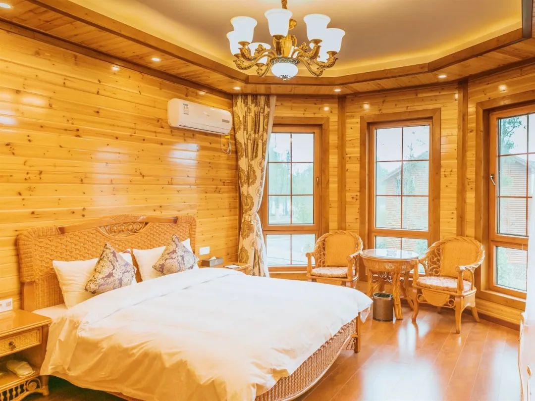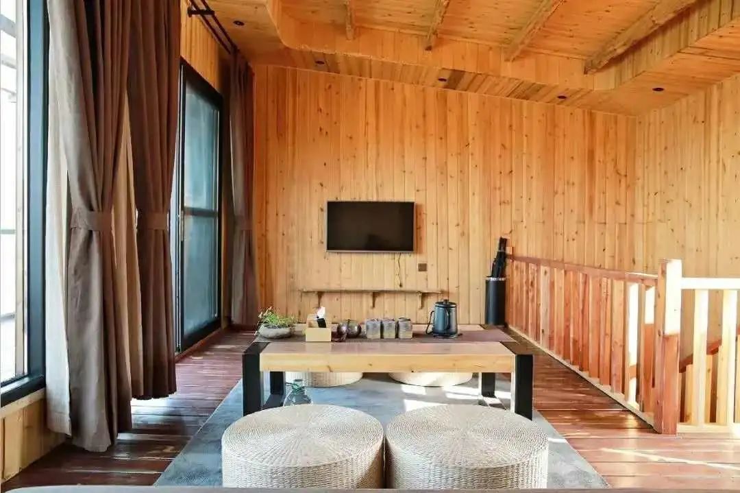 独栋双层木屋别墅:一楼洗漱、住宿、二楼观景与休闲。室内风格也采用原木设计,质朴简单,但又有现代的精致与用心细节,浑然天成。