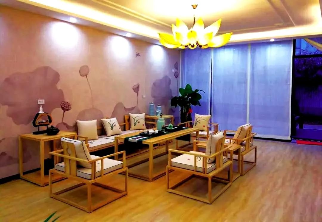 荷舍一共分为两栋——中式复古和北欧简约。中式复古那栋楼,全木质的家具,手工棉麻的窗帘,体现着中国传统美学,山水荷花映衬。