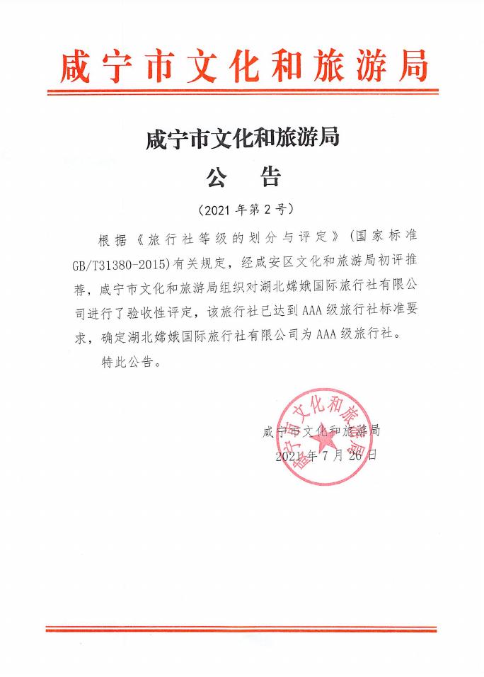 关于确定湖北嫦娥国际旅行社有限公司为AAA级旅行社的公告