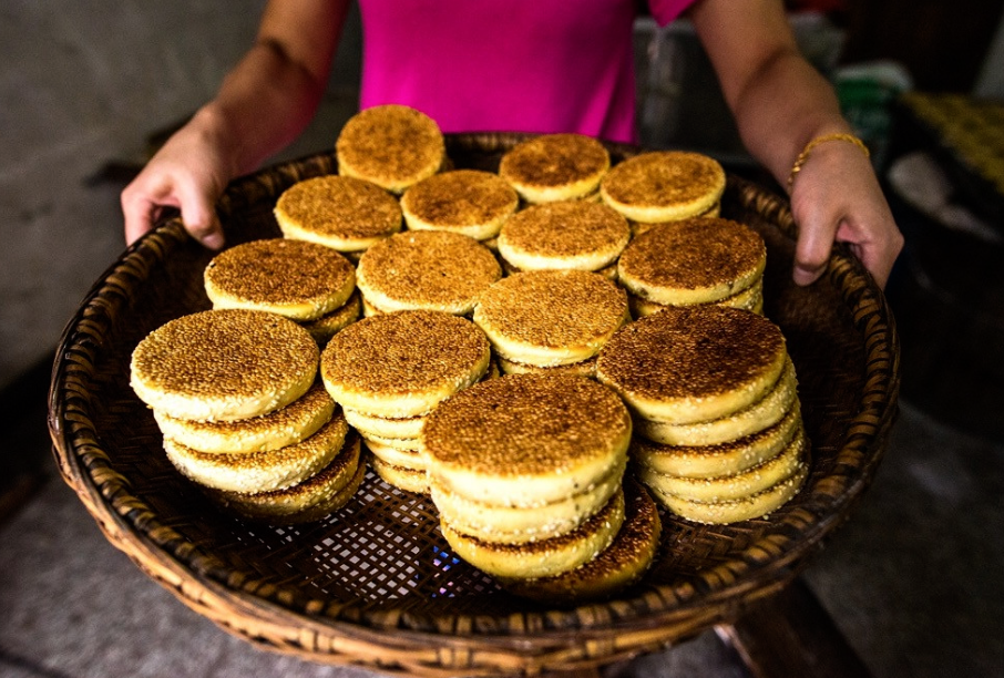 通山大畈芝麻饼采用古老纯手工工艺制作,原料包括面粉、芝麻、山茶油、桂花、蜂蜜、冰糖、陈皮、金钱桔、葡萄干等十几种食材,不添加任何添加剂,经过原料搅拌、揉搓、捶打、成型等手工工艺,再经一蒸二熏三烘四烤即可出笼,口感酥脆,老少皆宜。